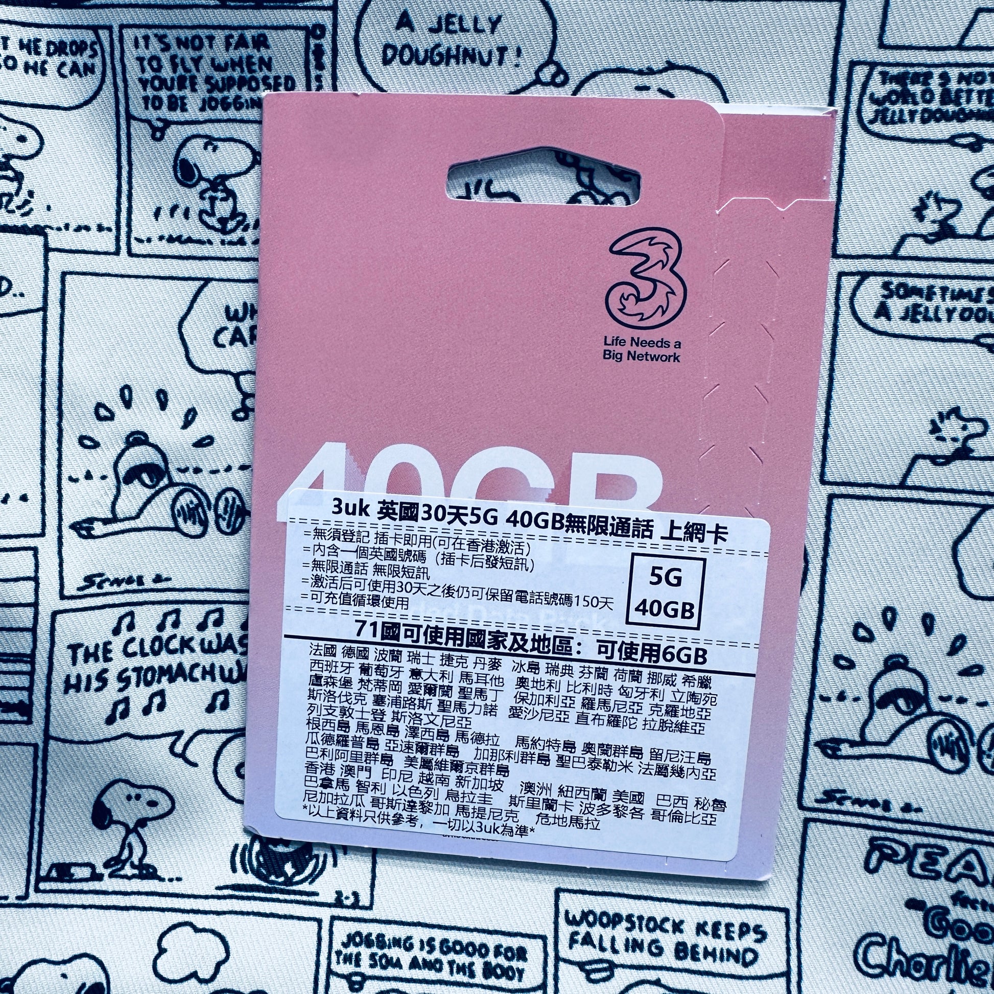 Three UK英國30日 40GB 漫遊數據卡|3UK英國+44通話免費&歐洲漫遊數據儲值卡|Pay As You Go SIM(提供英國電話號碼)