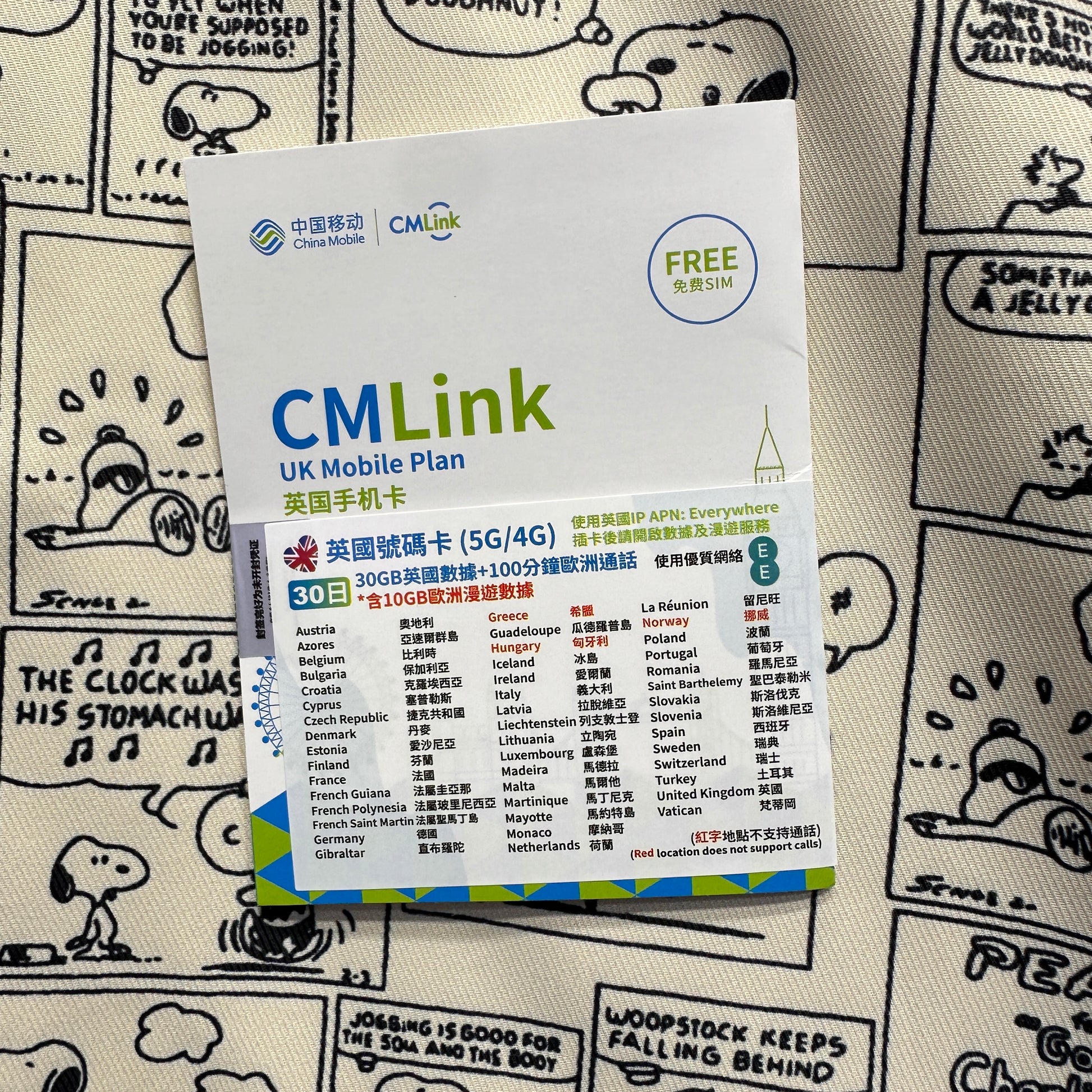 CMlink |30日英國&歐洲漫遊數據30GB儲值卡